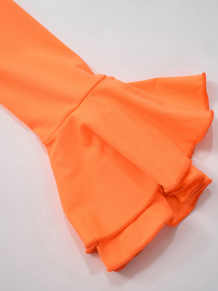 This elegant off-the-shoulder dress features dramatic trumpet sleeves and a streamlined silhouette in a timeless solid color. The one-shoulder neckline adds a touch of sophistication, while the flowy design ensures all-day comfort and style.