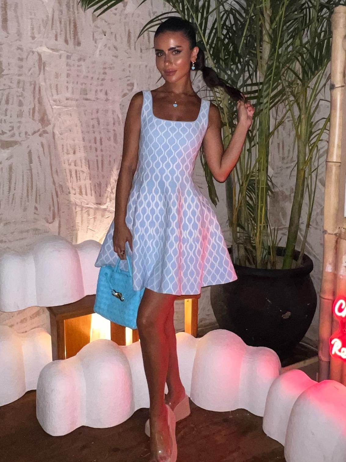 This two-piece knit dress features a playful wave-stripe A-line skirt paired with a figure-hugging sleeveless tank top. Perfect for layering or wearing alone, this versatile outfit offers a chic and modern look. The soft, stretchy knit fabric ensures comfort while the cinched waist creates a flattering silhouette. Ideal for casual outings or dressed-up occasions, it's a stylish choice for the fashion-forward woman.